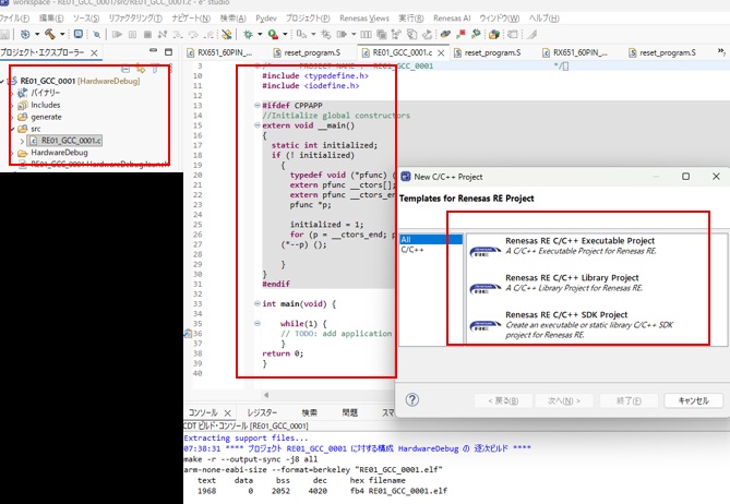 試してみると、このマイコンは、e2Stdioで開発もビルドもできるようです。