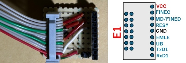 実験で、E1との接続をVcc,MD/FINED,RES#,GNDの4本にしてみましたが(回路図中のUB,TxD1,RxD1を