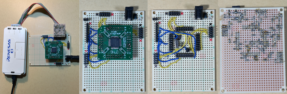 E1と実験ボードとの接続は、全てをつなぐ必要はないと思いますが、ルネサスの資料の接続図そのままにしています。