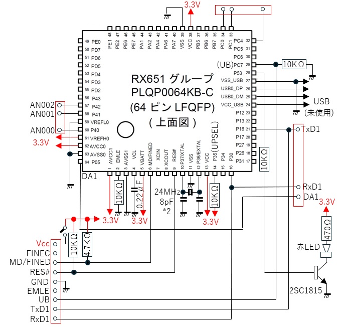 ※注 回路図では、VCC-GND間、AVCC-AVSS間、AVREFH-AVREFL間の0.1μFのコンデンサの記述を省略しています。
